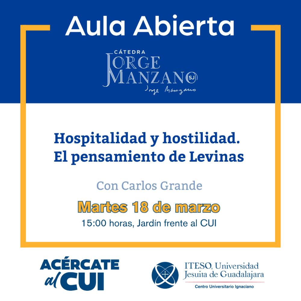 La Cátedra Jorge Manzano, SJ del Centro Universitario Ignaciano del ITESO invita al Aula Abierta: Hospitalidad y hostilidad. El pensamiento de Levinas. Nos acompaña el Mtro. Carlos Grande