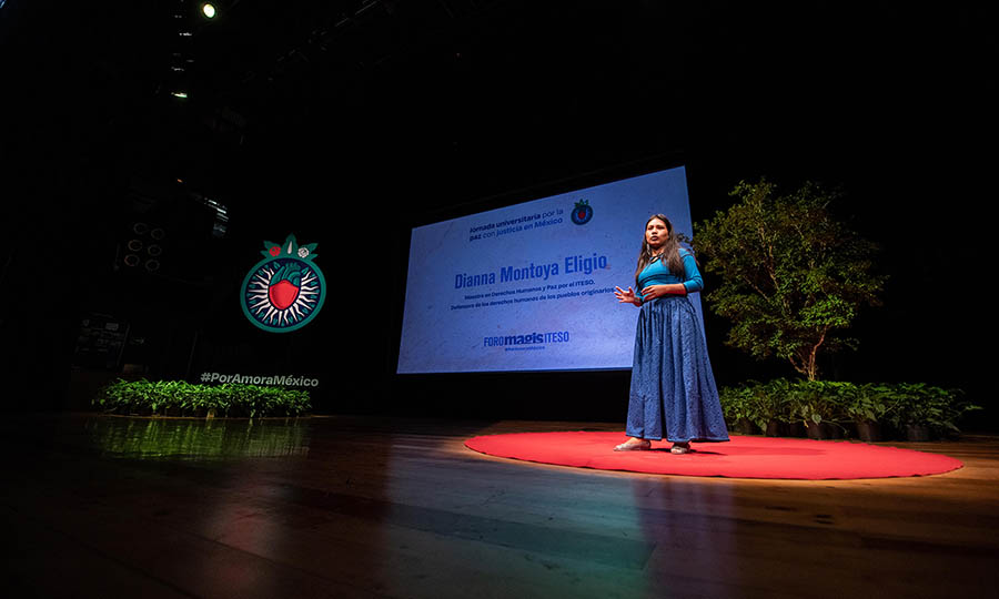 Un primer paso para acercarse a la gente es conocer sus historias. Después del Rector subió al escenario Dianna Montoya Eligio, egresada wixárika de la Maestría en Derechos Humanos y Paz del ITESO, quien trabaja en la defensa de los derechos humanos de los pueblos originarios. Señaló que una de las batallas más importantes que libran los pueblos indígenas de Jalisco, y del país en general, es por el reconocimiento de sus derechos como personas y sus derechos como pueblos —derecho a la identidad, a la tierra, a la autodeterminación—. “No podemos construir la paz si no comprendemos y reconocemos al otro. Los pueblos originarios han padecido históricamente la desigualdad y la discriminación”. Montoya Eligio señaló que los indígenas no sólo son víctimas, sino que en ocasiones también afectan los derechos humanos de otras comunidades, por lo que, añadió, “no podemos aspirar a la paz sin primero conocer dónde estamos. A todos nos toca reflexionar qué estamos haciendo desde nuestras trincheras”.